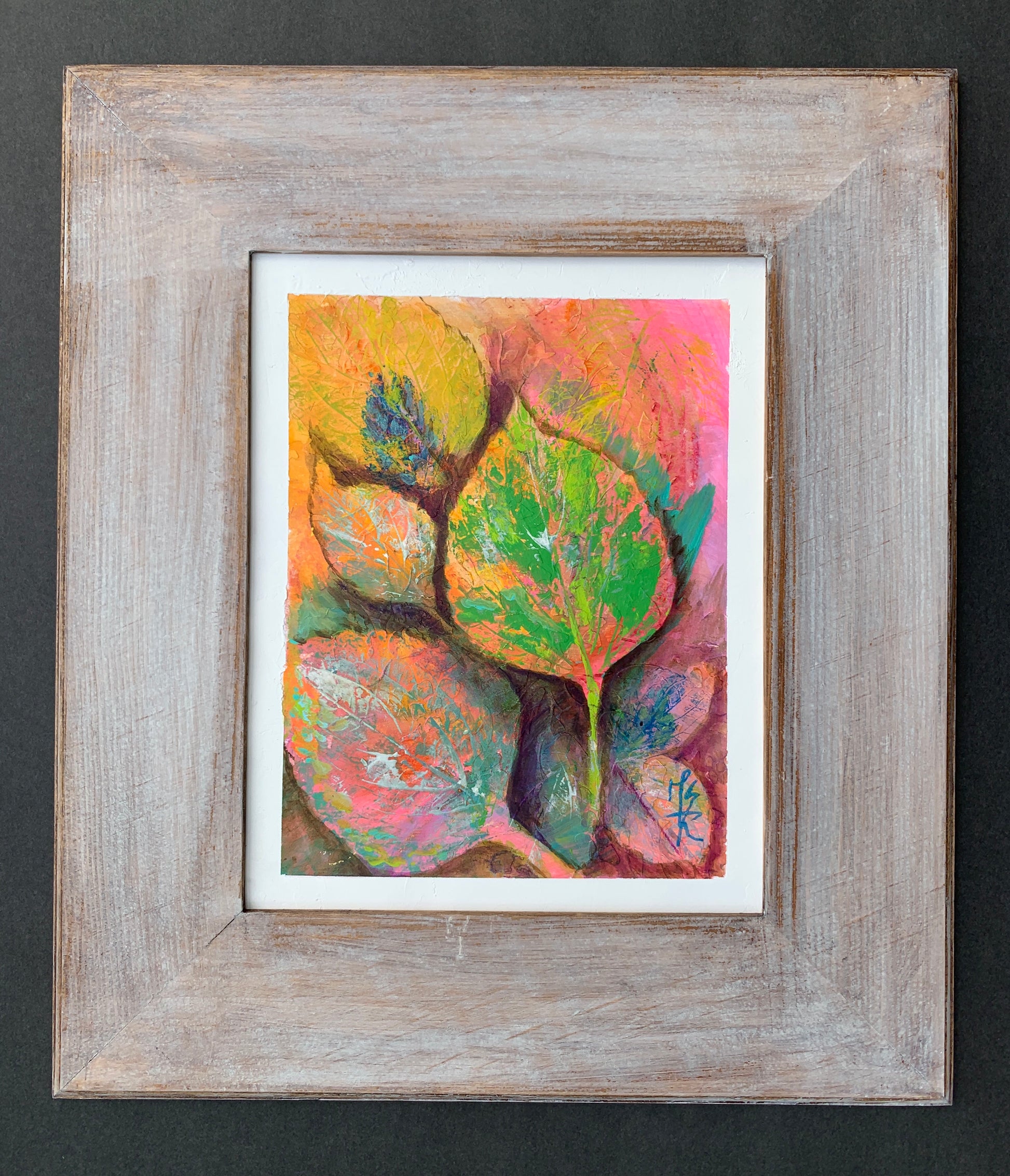 Sour Flavor captures the vibrant energy of autumn through mixed-media artistry. Hand-painted on paper with warm orange, yellow, and green leaf motifs, each piece is sealed with protective wax to preserve its tactile depth and luminous finish. Part of The Anti-Stress Collection, this work combines organic forms with contemplative color to create a calming focal point that energizes any space. Perfect for collectors seeking authentic, nature-inspired art. The whitewashed driftwood frame complements the organic composition, bringing warmth and authenticity to any interior.